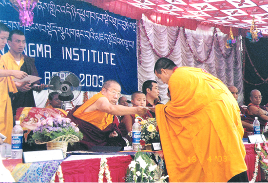 In 1994, HH Penor Rinpoche and HH Taklung Tshetul Rinpoche including their khenpos and a hundred more of lamas were at Bodhgaya where the Bhuddha attained enlightenment. It was then that Rinpoche took his bikshu precepts. He got the name Thubten Yeshey Namgel , and learned empowerments, oral transmissions which he practices to the completion.