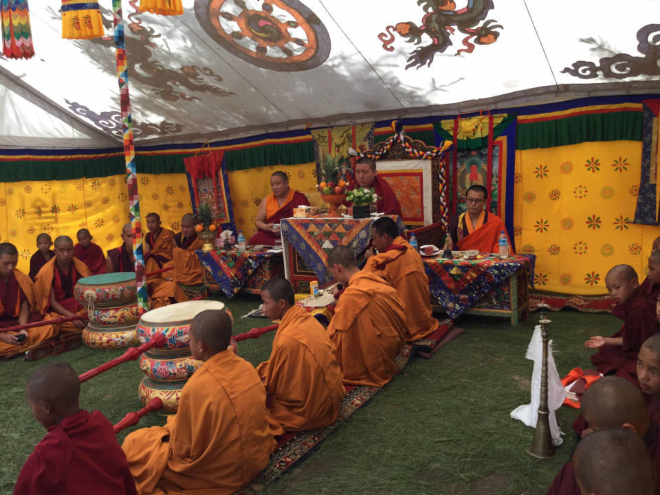 At the age of seven, Lama Tharchung Rinpoche invited Khentrul Dorje Thokmeth Rinpoche to his Dratshang and enthroned him in a grand ceremony amidst thousands of lamas, tulkus, monks, nuns, government officials and members of the general public. After that he engaged in learning the subjects of monastic education like reading and writing, grammar, playing the conch and ritual trumpet, making ritual cakes and ornaments, and the three skills of ritual dance, mandala drawing and melodious chanting, until the age of 20. Later he served in the capacity of supervisor, treasurer, secretary, school teacher, and so forth, as an ordinary monk